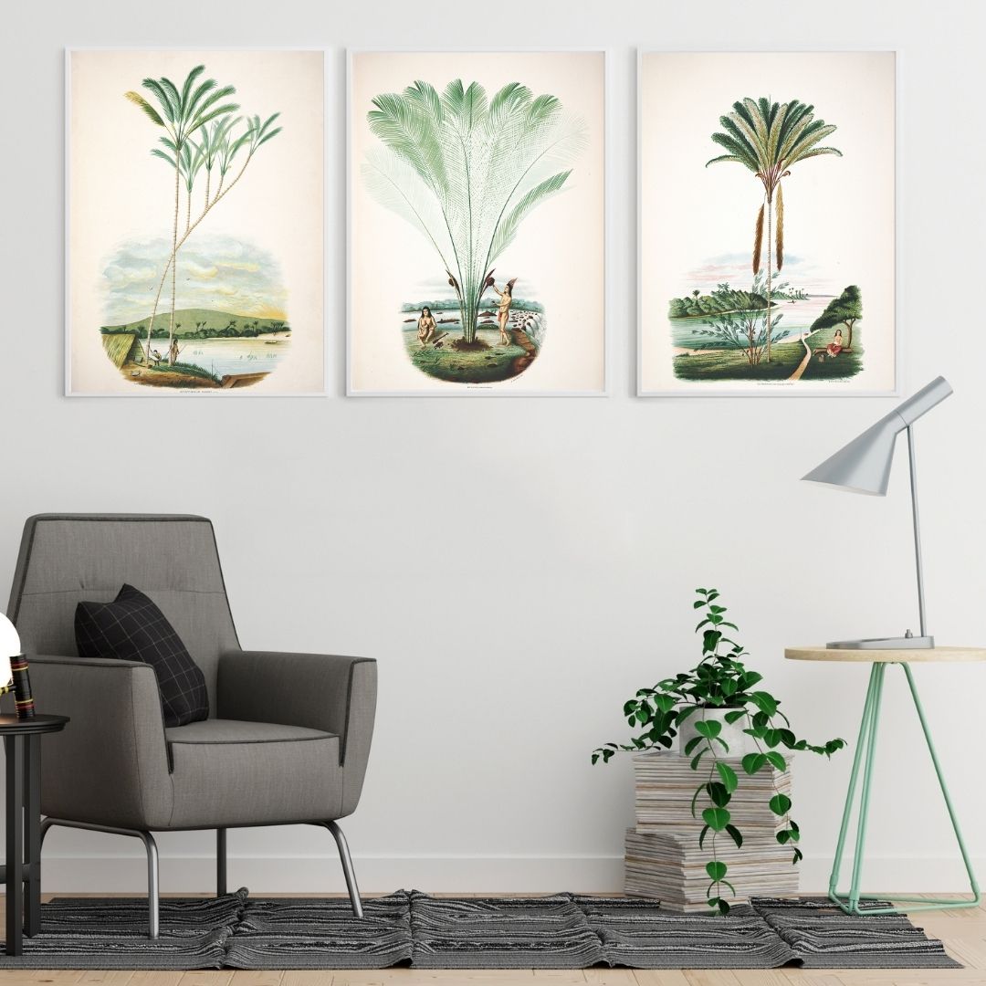 Coleção com três reproduções de litografias sobre palmeiras e rios da Amazônia brasileira. De autoria do famoso botânico brasileiro João Barbosa Rodrigues, as ilustrações foram publicadas originalmente em 1903 e fazem parte de uma das mais importantes obras já escritas sobre palmeiras brasileiras.