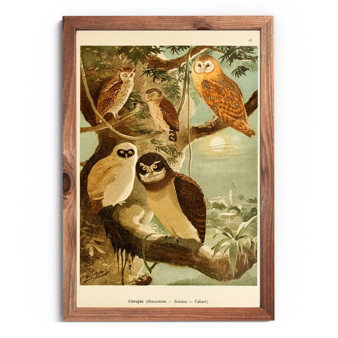 Reprodução de litografia sobre corujas da Amazônia brasileira. A prancha faze parte do livro “Album de Aves Amazônicas”, publicado em fascículos entre 1900 e 1906 por Emílio Goeldi, zoólogo suíço e então diretor do "Museu Paraense de História Natural e Ethnographia”, com desenhos de Ernesto Lohse, “desenhista-lithographo” do Museu. Após restauro digital, a prancha foi reimpressa em papel couché 250g e tamanho 29,7x42cm. Ilustração NÃO inclui moldura, imagem meramente ilustrativa.