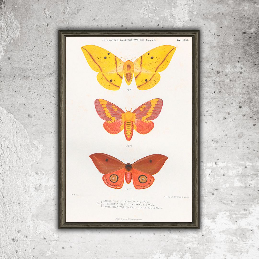 Reprodução de litografia sobre mariposas brasileiras. A gravura foi selecionada a partir do livro "Lepidopteros do Brasil", publicado originalmente em 1907. Uma das mais belas obras já produzidas sobre a fauna brasileira, as ilustrações são de autoria do entomólogo autodidata e professor de desenho Benedito Raimundo da Silva. Após restauro digital, a prancha foi reimpressa em papel couché 250g e tamanho 29,7x42cm. A ilustração NÃO inclui moldura, imagem meramente ilustrativa.
