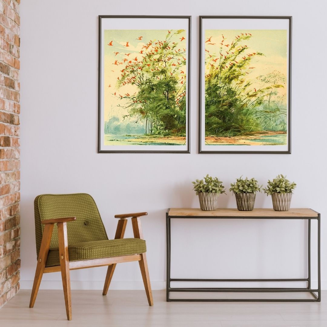Composição dividida em duas pranchas complementares da obra "Scena de um ninhal de Guarás (Ibis rubra) na costa atlântica da Ilha de Marajó". A prancha faze parte do livro “Album de Aves Amazônicas”, publicado em fascículos entre 1900 e 1906 por Emílio Goeldi, zoólogo suíço e então diretor do "Museu Paraense de História Natural e Ethnographia”, com desenhos de Ernesto Lohse, “desenhista-lithographo” do Museu.