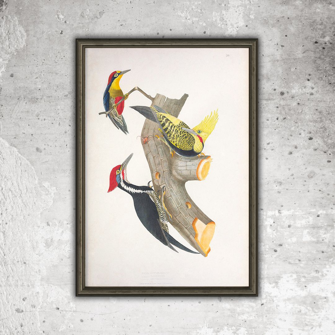 Prancha pica-paus publicada em 1834 por Jean Théodore Descourtilz. Após restauro digital, a prancha foi reimpressa em papel couché 250g no tamanho 29x42cm. A ilustração NÃO inclui moldura, imagem meramente ilustrativa.