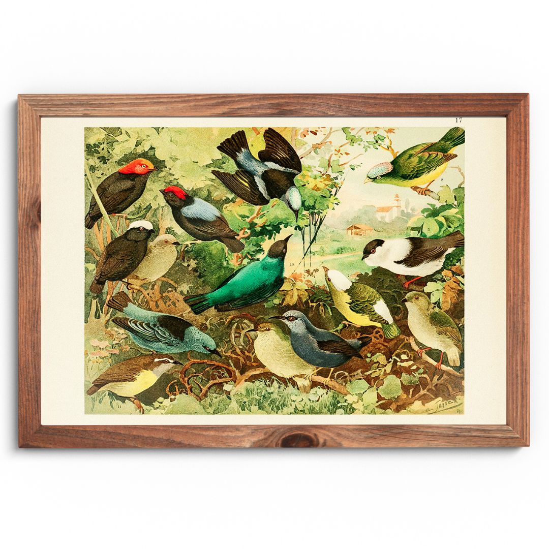 Reprodução de litografia sobre tangarás e saís da Amazônia brasileira. A prancha faze parte do livro “Album de Aves Amazônicas”, publicado em fascículos entre 1900 e 1906 por Emílio Goeldi, zoólogo suíço e então diretor do "Museu Paraense de História Natural e Ethnographia”, com desenhos de Ernesto Lohse, “desenhista-lithographo” do Museu.